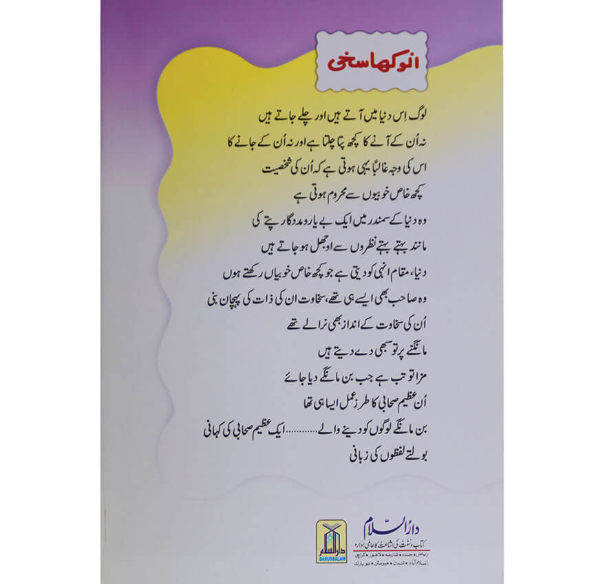 لوگ اس دنیا میں آ تے ہیں اور چلے جاتے ہیںنہ ان کے آنے کا کچھ پتا چلتا ہے اور نہ ان کے جانے کا اس کی وجہ غالبا یہی ہوتی ہے کہ ان کی شخصیت کچھ خاص خوبیوں سے محروم ہوتی ہے وہ دنیا کے سمندر میں ایک بے یارومددگار پتے کی مانند بہتےبہتے نظروں سے اوجھل ہو جاتے ہیں دنیا، مقام انہی کو دیتی ہے جو کچھ خاص خو بیاں رکھتے ہوں وہ صاحب بھی ایسے ہی تھے ،سخاوت ان کی ذات کی پہچان بنی ان کی سخاوت کے انداز بھی نرالے تھے مانگنے پر تو سبھی دے دیتے ہیں مزاتو تب ہے جب بن مانگے دیا جاۓ ان عظیم صحابی کا طر زعمل ایسا ہی تھا بن ماگلے لوگوں کو دینے والے. ایک عظیم صحابی کی کہانی بولتے لفظوں کی زبانی