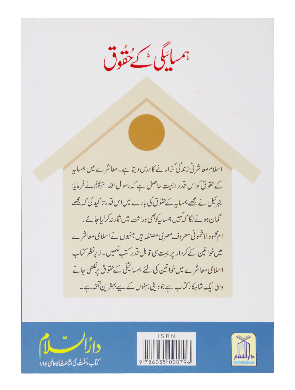 اسلام معاشرتی زندگی گزارنے کا درس دیتا ہے۔ معاشرے میں ہمسایہ کے حقوق کو اس قدر اہمیت حاصل ہے کہ رسول اللہ ﷺ نے فرمایا: جبر ائیل نے مجھے ہمسایہ کے حقوق کی بارے میں اس قدر تا کید کی کہ مجھے گمان ہونے لگا کہیں ہمسا یہ کوبھی وراثت میں شمار نہ کر لیا جاۓ ۔ کہ کہیںام محمودالاشمونی معروف مصری مصنفہ ہیں جنہوں نے اسلامی معاشرے میں خواتین کے کردار پر بہت سی قابل قدر کتب لکھیں ۔ زیر نظر کتاب اسلامی معاشرے میں خواتین کی لئے ہمسائیگی کے حقوق پر لکھی جانے والی ایک شاہکار کتاب ہے جو دینی بہنوں کے لیے بہترین تحفہ ہے ۔
