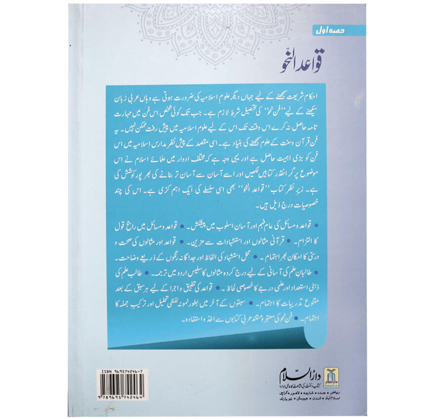 علوم نقلیہ کی جلالت وشان اپنی جگہ مسلم ہے، مگر یہ بھی ایک حقیقت ہے کہ ان کے اسرار ورموز اور معانی ومفاہیم تک رسائی حاصل کرناعلم نحو کے بغیر ممکن نہیں ہے۔ یہی وہ عظیم فن ہے، جس کی بدولت انسان امامت کےمرتبے اور اجتہاد کے مقام تک پہنچ جاتاہے ۔ تمام ائمہ کرام کااس بات پراجماع ہے کہ مرتبۂ اجتہاد تک پہنچنے کے لیے علم نحو کا حصول ایک لازمی شرط ہے۔ قرآن وسنت اور دیگر عربی علوم کوسمجھنےکے لیے’’ علم نحو‘‘کلیدی حیثیت رکھتاہے۔ اس کے بغیر علوم اسلامیہ میں رسوخ وپختگی پیدا نہیں ہوسکتی ۔نحو وصرف کی کتابوں کی تدوین وتصنیف میں علماء عرب کےساتھ ساتھ عجمی علماء نے بھی بڑھ چڑھ کر حصہ لیا ۔اور اپنی اپنی مقامی زبانوں میں اس فن پر کتب تصنیف فرمائیں۔ زیر نظرکتاب وفاق المدارس السلفیہ کے ذمہ داران کے حکم پر تجربہ کار ،اور ماہر اساتذہ ومعلمین کی نگرانی میں الثانویة الخاصة کے نصاب کے لیےلکھی گئی ہے۔ جسے مکتبہ دار السلام لاہور نے شائع کیاہے۔ اس کی ترتیب میں ایک جدید اور منفرد اسلوب اختیارکیا گیا ہے، جو عام فہم اور نہایت آسان ہے، تاکہ مبتدی طالب علم اس کو آسانی سے پڑھ سکیں ۔