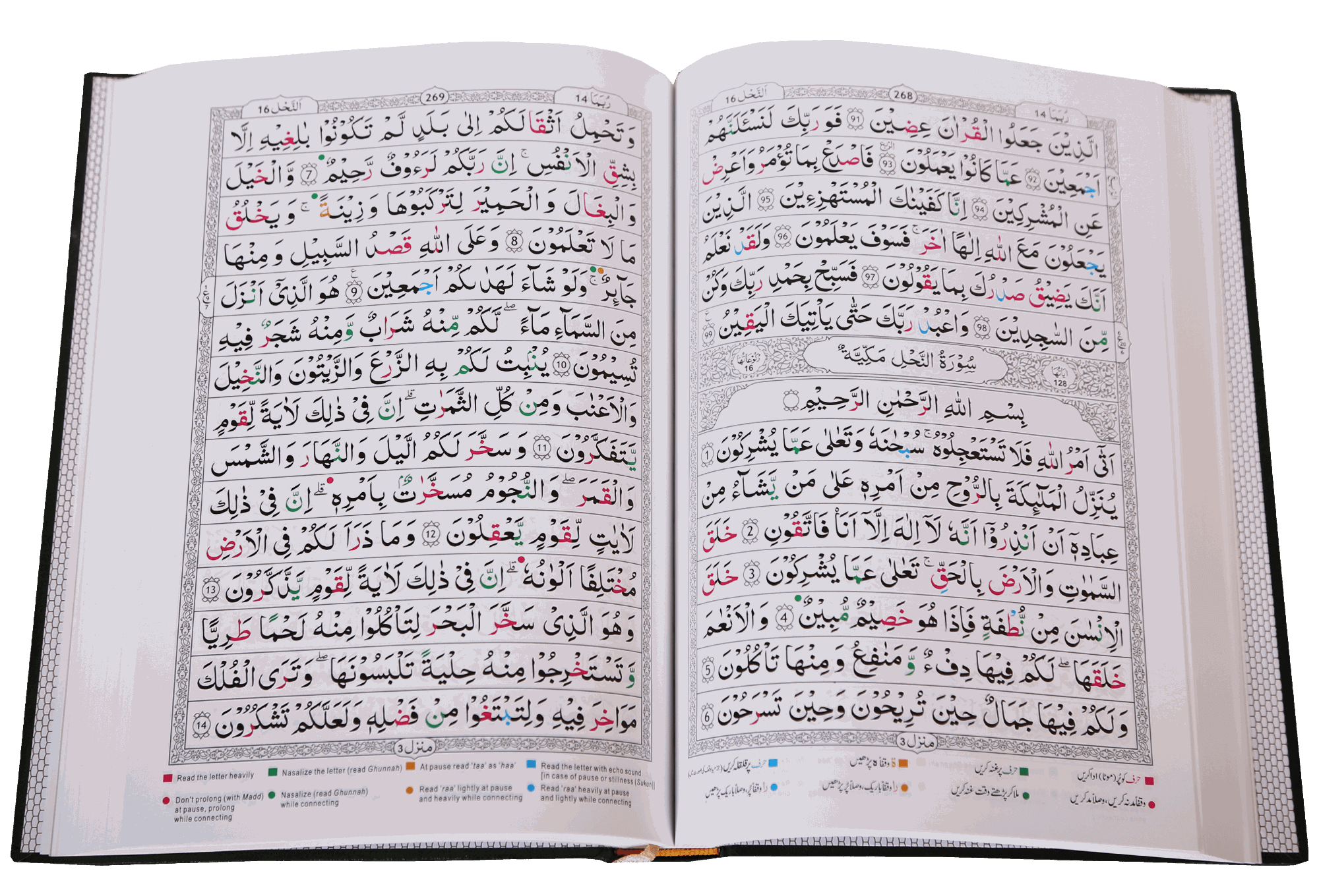 This copy of the Quran has 15 lines per page and its distinction is its colors for each tajweed rule, making it easier to follow and correct your tajweed recitation of the Holy Qur`an. The rules of tajweed are explained in English as well as in Urdu language on every page below the text.